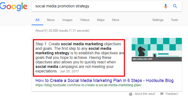 Let us analyze these two Google’s Featured Snippets for the keyword ‘content marketing plan’ and ‘social media promotion strategy’