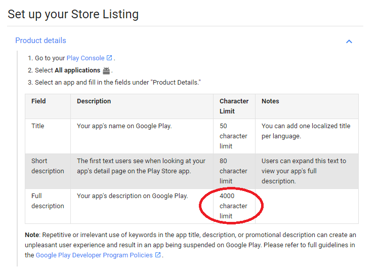 Unlike Apple’s App Store, Google Play Store gives you 4000 characters to describe your app. You should naturally sprinkle keywords or key phrases when you write a full description of your application.