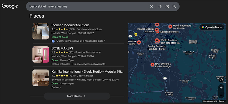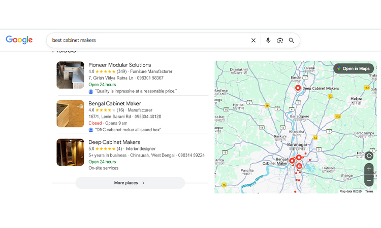 - Local seo will help you get local leads. When someone searches “best cabinet makers near me,” and if you have correct seo optimization on your website, then your website with Google Maps embedded Google Business Profile will pop. This is the highest proof of authenticity and reliability.