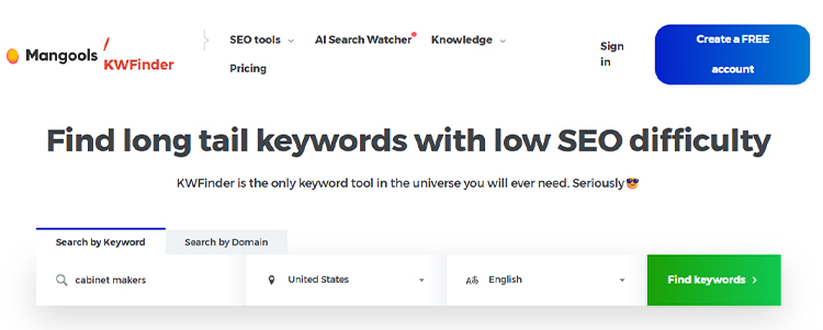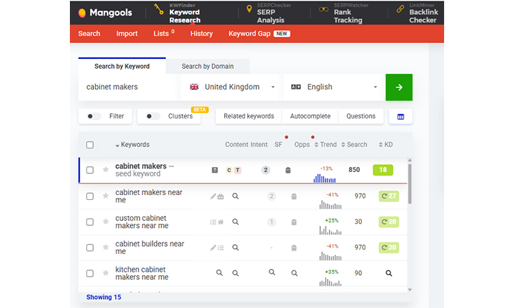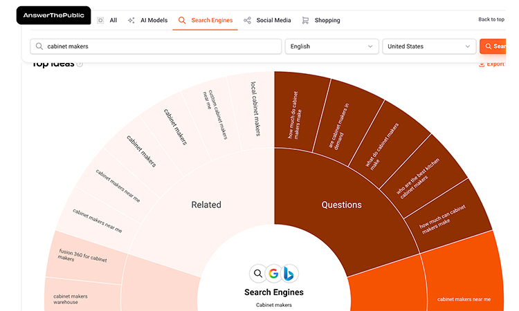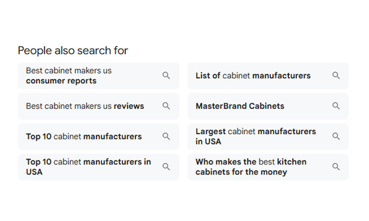 You can simply use Google to find search terms for the initial research. Type the main keyword, like “cabinet makers” on Google, and let Google help you with various new words associated with this specific phrase.