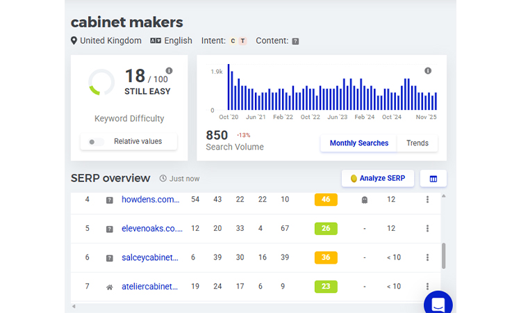 Keyword Volume will show how many times that particular keyword is searched in one month. It will show how popular that specific keyword is. If you choose the most volume keywords, then you may get more potential customers. But it is a little bit competitive, if your website is well established then you can go for this high volume keyword, or if you make a new website, then you should choose moderate volume + high intent keywords. If you get 100–500 searches/month, it is also very valuable for a cabinet maker’s business growth.